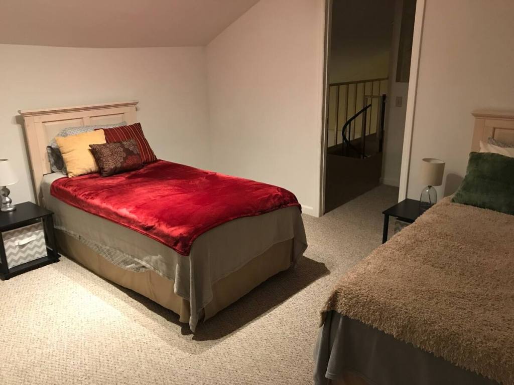 The downstairs was renovated with new floors, walls, lighting, and tongue & groove wood ceilings. There is a full bath downstairs. The upstairs has four bedrooms and 1.5 baths. The bedrooms have one queen, one full, two twins, and one twin. There is a pull-out sofa downstairs that can sleep 2.